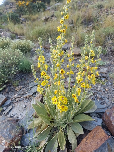 A tall biennial herbaceous plant with woolly leaves and tall spikes of yellow flowers.