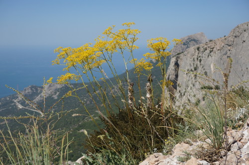 A tall, herbaceous plant with large, divided leaves and umbels of white flowers, native to Europe and Asia.
