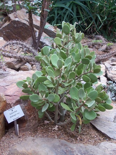A succulent species native to South Africa, recognized for its round, silvery-green leaves with reddish edges and compact, tree-like growth habit.