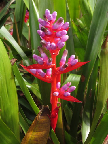 A compact bromeliad species known for its vibrant center coloration when blooming, typically forming rosettes of broad, strap-like leaves.