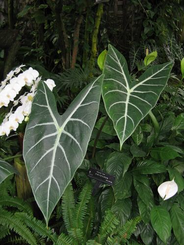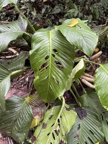 A tropical evergreen epiphytic plant with glossy, heart-shaped leaves and distinctive spathe flowers.
