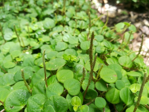 A compact, ornamental plant with fleshy, spotted leaves and a trailing habit, native to tropical regions.