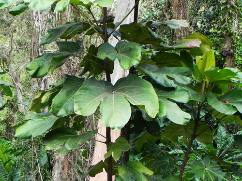 A large, fast-growing tree native to the Caribbean, known for its striking blue-green leaves and large, showy flowers.