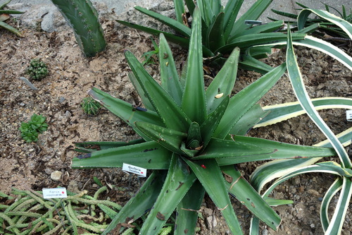 A large, robust succulent with a rosette of fleshy, gray-green leaves and tall spikes of yellow or orange flowers.