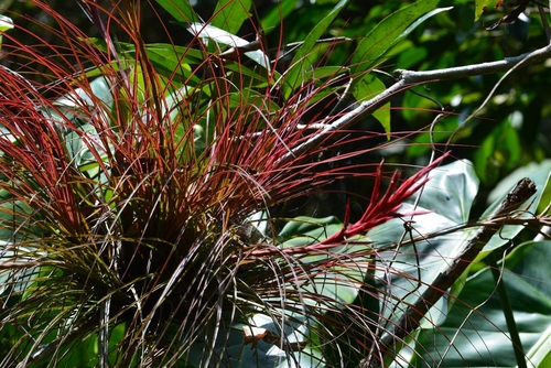 An epiphytic bromeliad native to South America, known for its striking, silvery foliage and vibrant purple flowers.